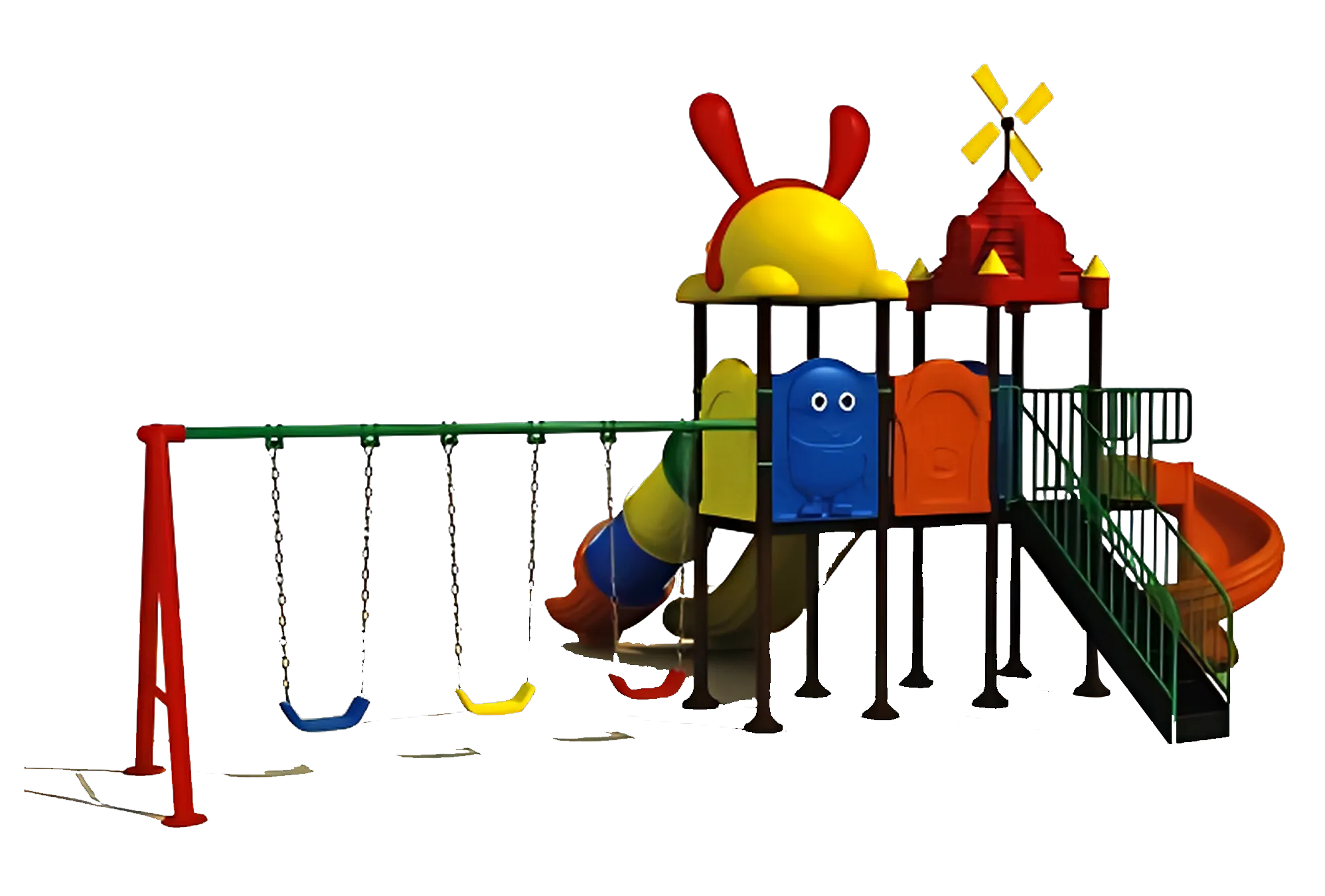 A fun and vibrant outdoor playground featuring double slides, tunnels, and swings — designed for kids aged 2–15 years. Perfect for schools, parks, and community play areas.