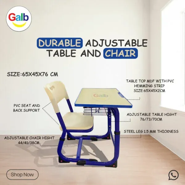 Durable and adjustable table and chair. Size 65x45x76 cm