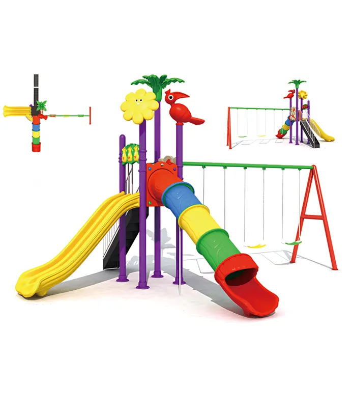 This vibrant and fun-filled playground set features a slide, swings, and playful elements like a bird, flower, and palm tree designs, ideal for children ages 2-10.
