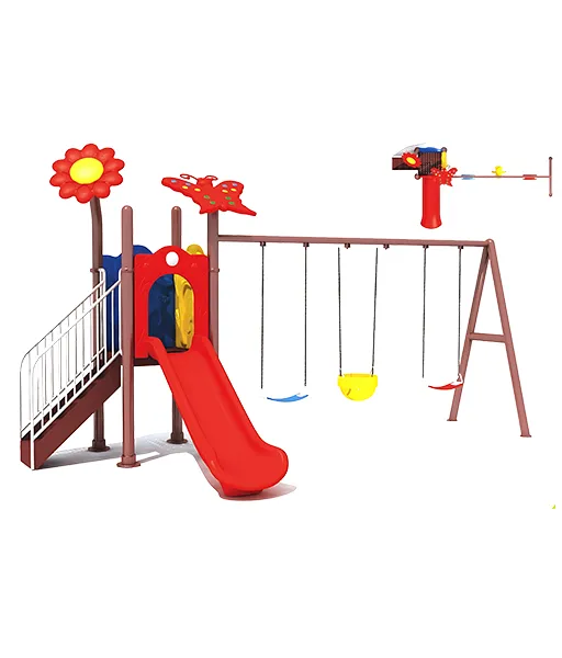 A colorful and fun playground set with swings and a slide, featuring playful flower and butterfly designs, perfect for children aged 2-15 years.