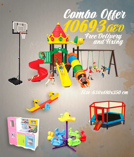 Large premium outdoor playground package with tunnel slides, multi swing station, trampoline, basketball stand, kitchen playset & multi ride toys — perfect for villas, nurseries, schools, daycares & outdoor play zones in UAE.